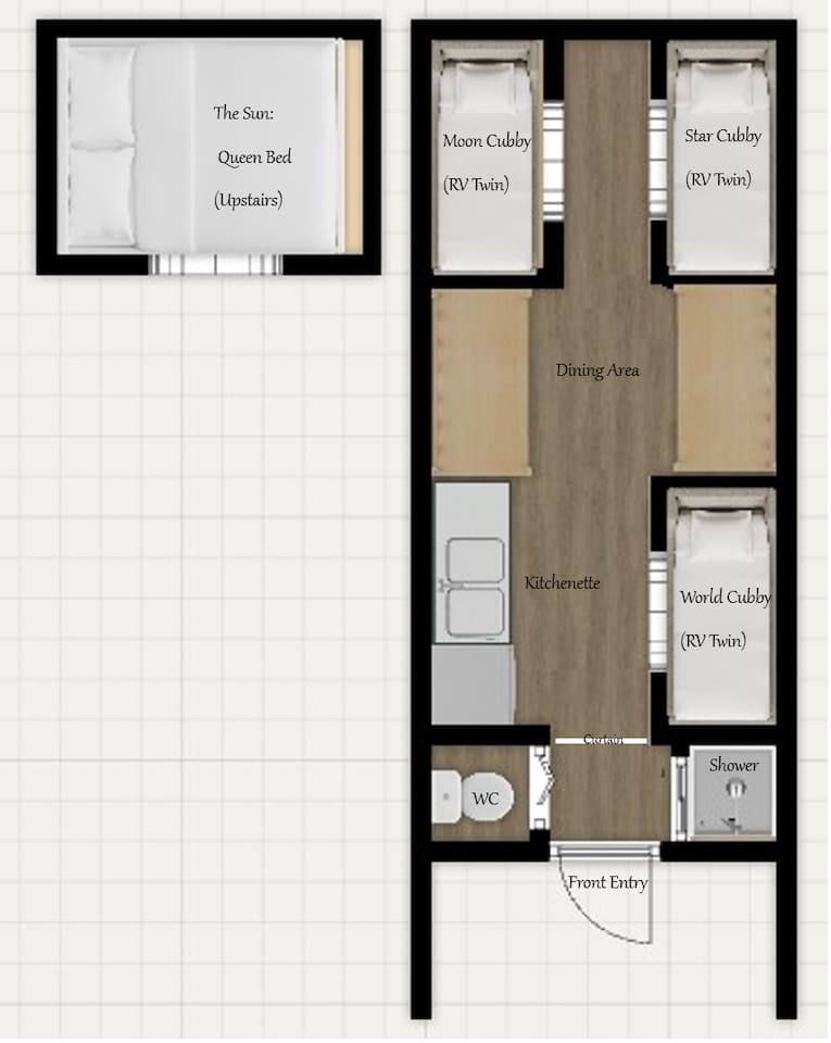 We want to be transparent about the Dream Wagon's layout so you can decide if it's the right fit for your group. Entry requires climbing stairs, and the entryway hallway is narrow (less than 24 inches wide). The Sun cubby requires climbing up to access, while The Star and Moon cubbies require ducking and crawling to enter. The World cubby has easy, level access with no climbing or ducking.