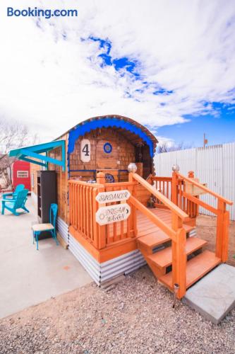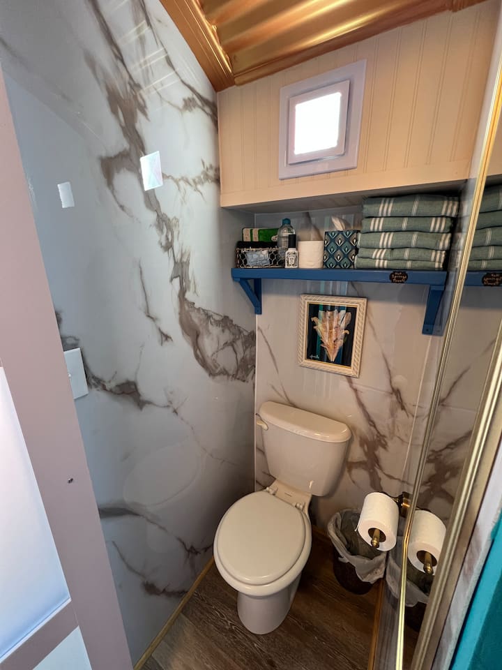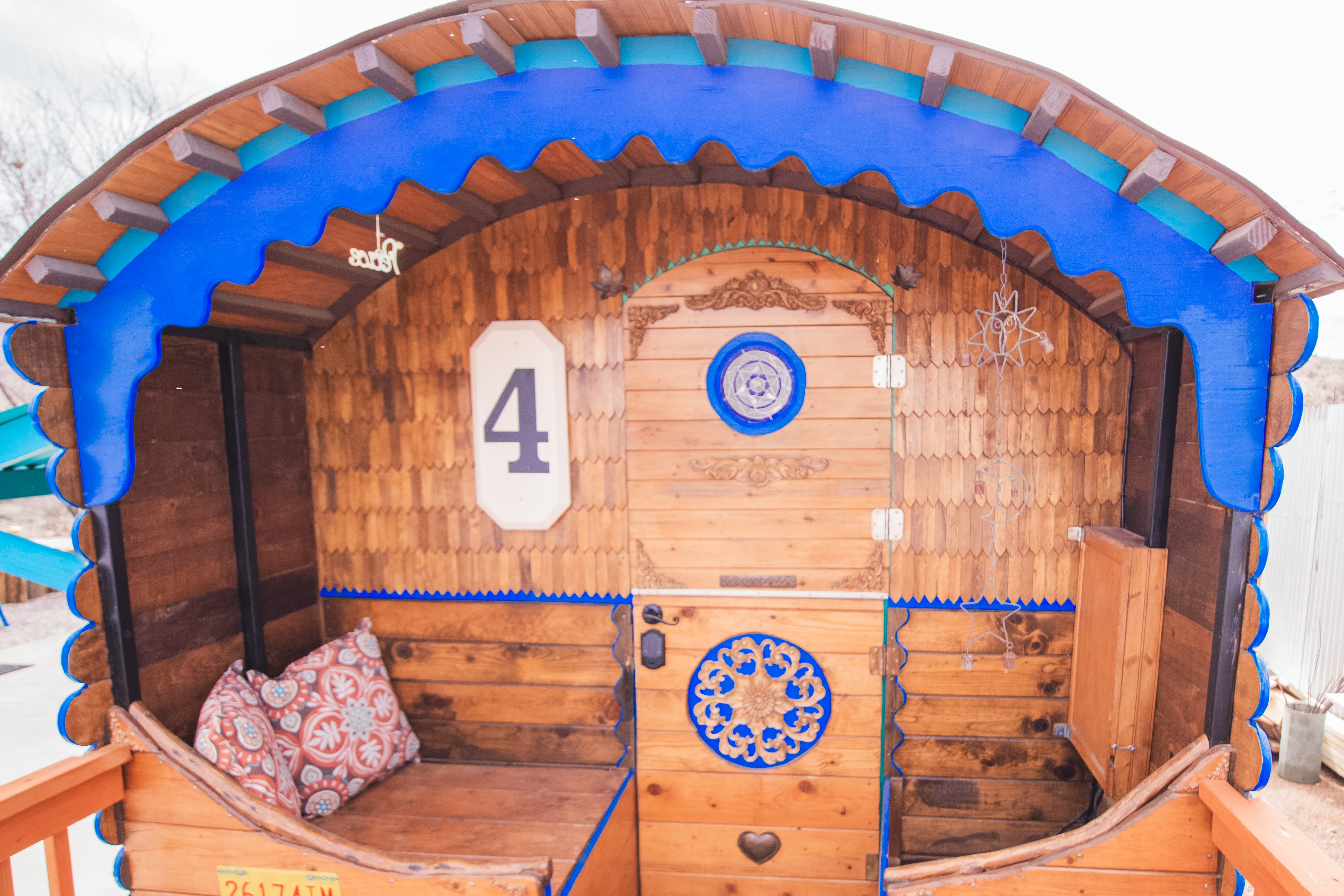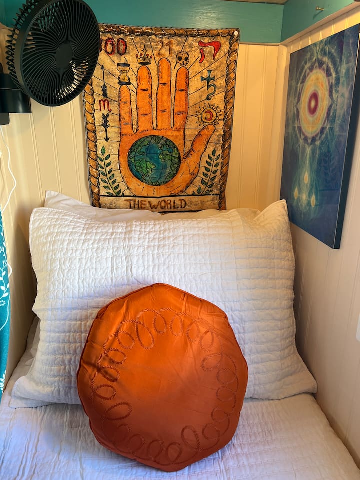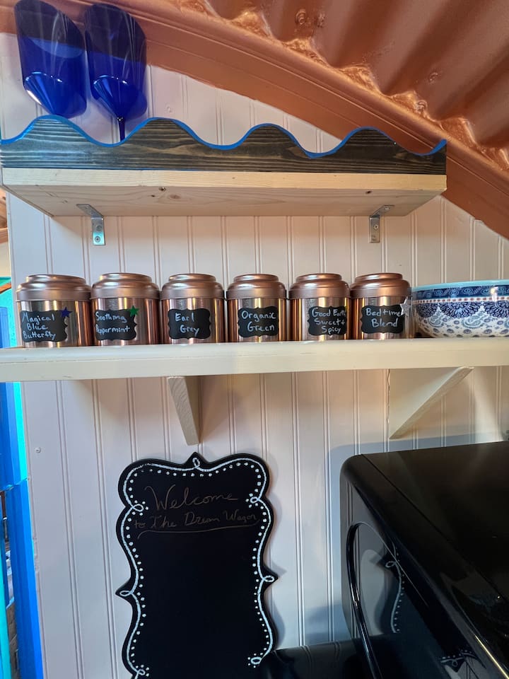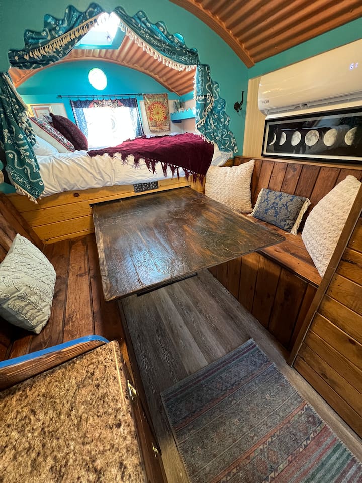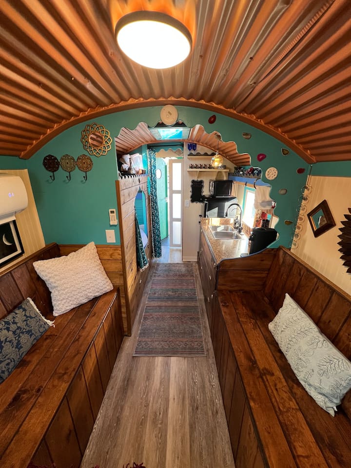 The Dream Wagon is incredibly unique. It is located in Spellbound Springs, a magical hot springs tiny home resort. The wagon is great for groups as it includes 4 sleeping cubbies, each with a charging outlet, fan, light, and privacy curtains. The sleeping cubbies are as follows: The Sun: Queen bed. Must climb up to reach it. Has a skylight to watch the stars at night. The Star: RV Twin (30" by 75", just a little narrower than a standard twin). Underneath The Sun cubby, so you must duck and crawl to reach it. The Moon: RV Twin (30" by 75", just a little narrower than a standard twin). Also underneath The Sun, so you must duck and crawl to reach it. The World: Short RV Twin (28" by 72", a bit smaller overall than a twin). No climbing or ducking required. This cubby is opposite the kitchen and doubles as a daybed/reading nook (although all cubbies are pretty great reading nooks). The Kitchen features a retro-style mini fridge with a separate freezer compartment, microwave, sink, Nespresso machine with pods, a French press (in case you are particular and travel with your own coffee), an electric hot water kettle, a curated tea bar with 6 varieties of tea, and dishes and silverware for 5. RO drinking water is provided by a small tap in the kitchen. The Bathroom includes a separate water closet (toilet room) and shower. Regular and Turkish cotton hot springs towels are provided, along with EO Organics bath products, micellar water, makeup wipes, and sheet face masks (nothing better than a mini facial on vacation after soaking). The Dining area has a pull-out table and benches and fun mirrors and moon artwork. The Wagon features a stunning curved copper ceiling, funky crystal agate wall, mystical and hot springs reading materials, oracle cards, and themed tarot decor. A mini-split keeps the space comfortable year-round, while individual fans in each cubby ensure cozy sleeping. We hope that guests have a magical and rejuvenating time here. There is a small deck and sitting area at the front of the wagon. Guests have access to all the wonderful outdoor areas at Spellbound, including the 24/7 hot springs (shared with other guests). The Dream Wagon is intentionally screen-free (no TVs) to encourage guests to unplug and fully enjoy the hot springs, outdoor spaces, and magical atmosphere. WiFi is available and guests are welcome to bring their own devices.