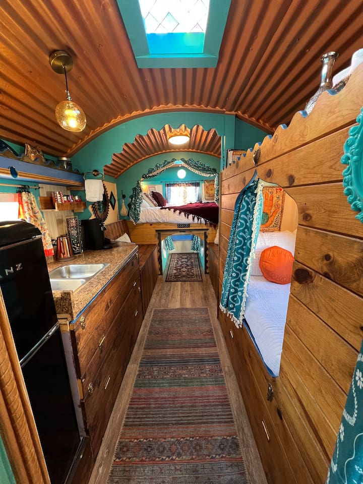 The Sundancer Dream Wagon features tarot-inspired curtained sleeping cubbies with 3 single beds (RV Twin sized) plus a queen, perfect for groups. Private bathroom with shower, kitchenette (Nespresso, French press, tea bar, fridge, microwave, sink), and access to natural hot springs. A stunning curved copper ceiling with gold and turquoise tones along with magical touches create a retreat that's whimsical and comfortable. Very close to the Riverfront Rotary Park and healing waters trailhead.